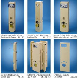 - Grumbach-Stein: viereckige, kompakte Elemente für WC, Waschtisch, Urinal, Bidet, Batterie und Leerräume.